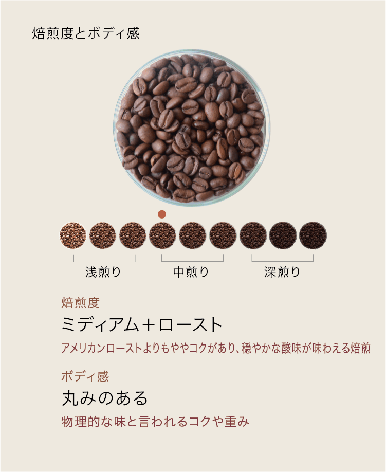 また、コスタリカコーヒーらしいみずみずしさがジューシーな口当たりとなって全体のバランスが良く、どなたでもリッチな気分になれる上品なナチュラルコーヒーの逸品といえるでしょう。